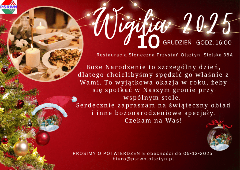 WIGILIA STOWARZYSZENIOWA odbędzie się w dniu 10-12-2025 o godzinie 16,00 w restauracji Słoneczna Przystań, Olsztyn, Sielska 38ALink do Google Maps https://maps.app.goo.gl/NrqN5Y2k2mSBevFS6https://www.facebook.com/slonecznaprzystanrestauracjaolsztyn/...